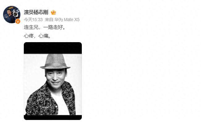 1月8日下昼,演员杨志刚发文吊唁演员吴连生:“连生兄,一谈走好。深爱,肉痛。”
